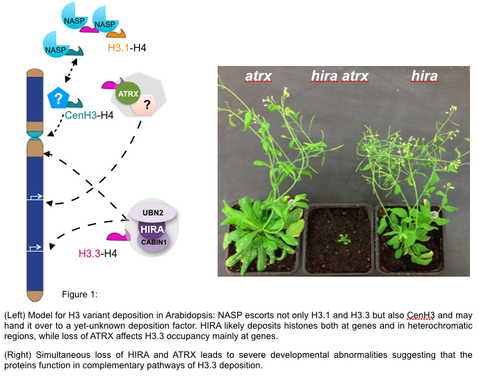 We showed that the histone chaperone HISTONE REGULATOR A (HIRA) and the Arabidopsis homologue of ALPHA THALASSEMIA-MENTAL RETARDATION X-LINKED (ATRX) function in complementary pathways of histone H3.3 deposition (Figure 1, Duc, 2015; 2017). We are currently aiming to understand the role of HIRA-mediated histone deposition in controlling transcriptional dynamics in response to environmental and developmental stimuli.